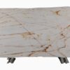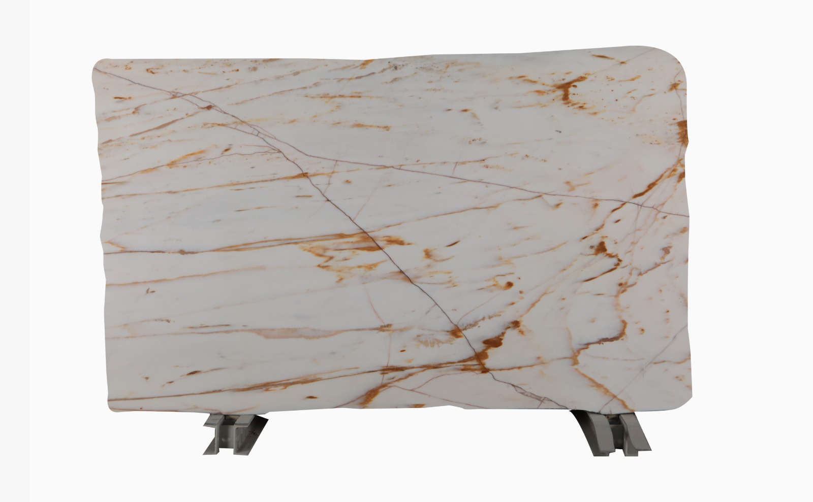 Sıcak sarı tonlarıyla zenginleştirilmiş beyaz bir zemin üzerinde çarpıcı gri damarlarla dikkat çeker. Bu, mekânlara sıcaklık ve lüks bir hava katarken, aynı zamanda görsel bir vurgu noktası oluşturur. Mutfak tezgahları, banyo kaplamaları, zemin döşemeleri ve duvar kaplamaları gibi iç mekân uygulamalarında kullanıldığında, Giallo Calacatta mermeri, modern ve şık bir görünüm sağlar ve mekânı aydınlatır.